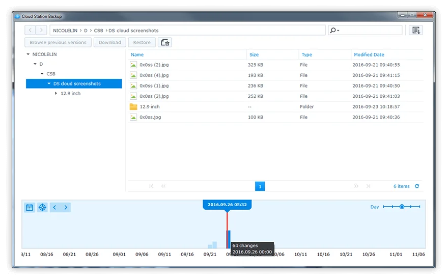 Bằng cách mở rộng tính sẵn có của hệ thống Btrfs sang một mô hình khác, NAS Synology phát triển bao gồm công nghệ chụp nhanh dữ liệu hiện đại, cho phép khôi phục dữ liệu theo thời gian một cách linh hoạt, trong khi chỉ mất một phần không gian lưu trữ so với giải pháp sao lưu truyền thống. Người dùng có thể sử dụng File Station hoặc Windows File Explorer để tự mình khôi phục lại các dữ liệu tập tin hay thư mục.