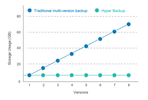 Với công nghệ sao lưu theo cấp độ gia tăng dữ liệu và chống trùng lặp dữ liệu trong các phiên bản, Synology Hyper Backup tối thiểu hóa dung lượng lưu trữ cần thiết trong việc sao lưu dữ liệu đa phiên bản. So sánh với giải pháp sao lưu truyền thống và các loại NAS khác, giải pháp sao lưu của Synology giảm thiểu đáng kể dung lượng lưu trữ dữ liệu backup trong khi vẫn giữ được tối đa phiên bản sao lưu dữ liệu theo nhu cầu của người dùng.