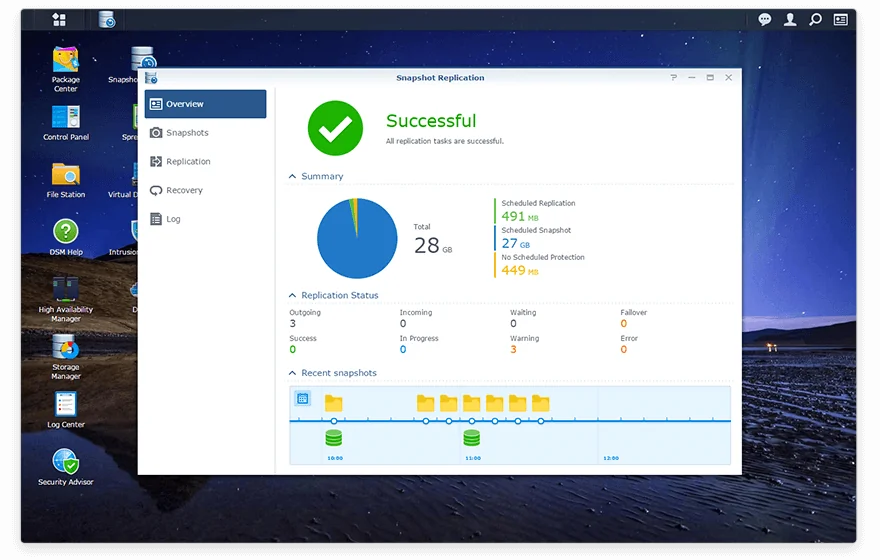 Snapshot Replication cung cấp giải pháp bảo vệ dữ liệu theo lịch trình, ngay lập tức; giúp đảm bảo những dữ liệu quan trọng của bạn ở thư mục chia sẻ, dữ liệu máy ảo trong các iSCSI LUNs, hoặc dữ liệu Docker DSM luôn an toàn và sẵn sàng trong các trường hợp xấu nhất.
