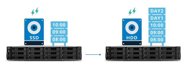 Bạn có thể tùy chỉnh chính sách lưu trữ các bản sao lưu khác nhau cho máy chủ chính và máy chủ khôi phục để giảm chi phí về dung lượng lư trữ. Ví dụ, đối với máy chủ chính chạy SSD, bạn có thể thiết lập lư trữ ít snapshot hơn; đồng thời lưu nhiều snapshot hơn ở máy chủ khôi phục chạy HDD.